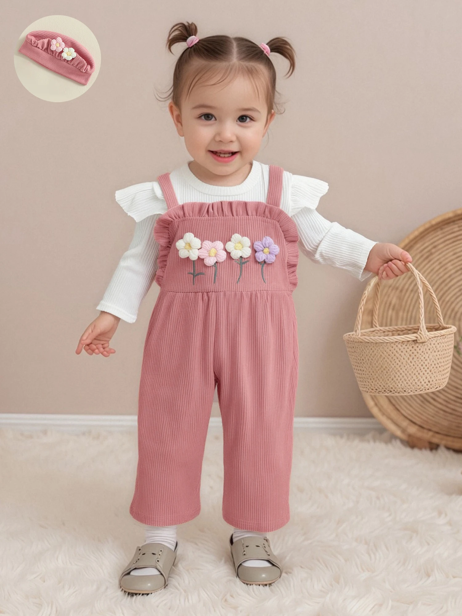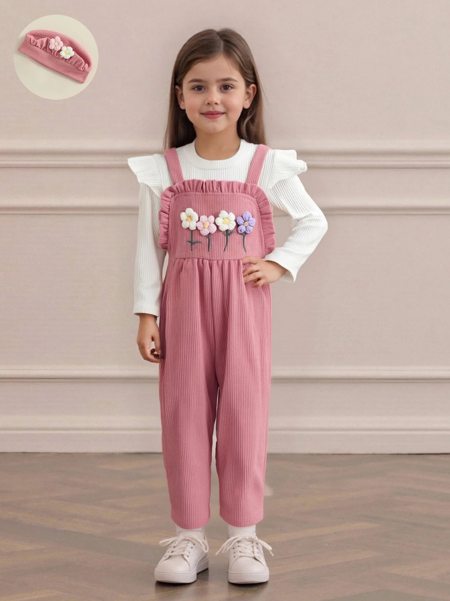 Dress your little one in cozy, charming style with this Girls 3-Piece Floral Overalls Knit Set With Hat for Kids.