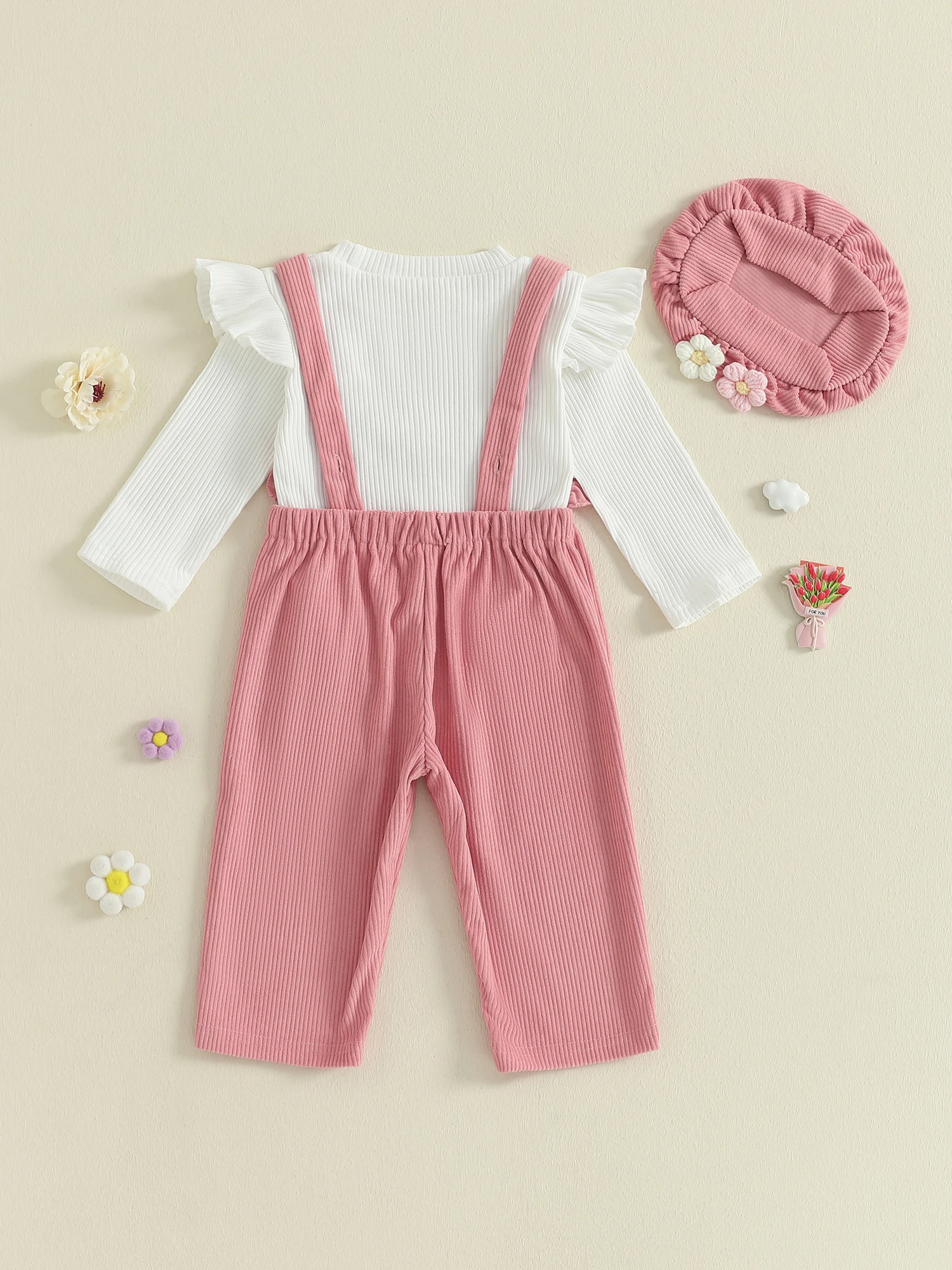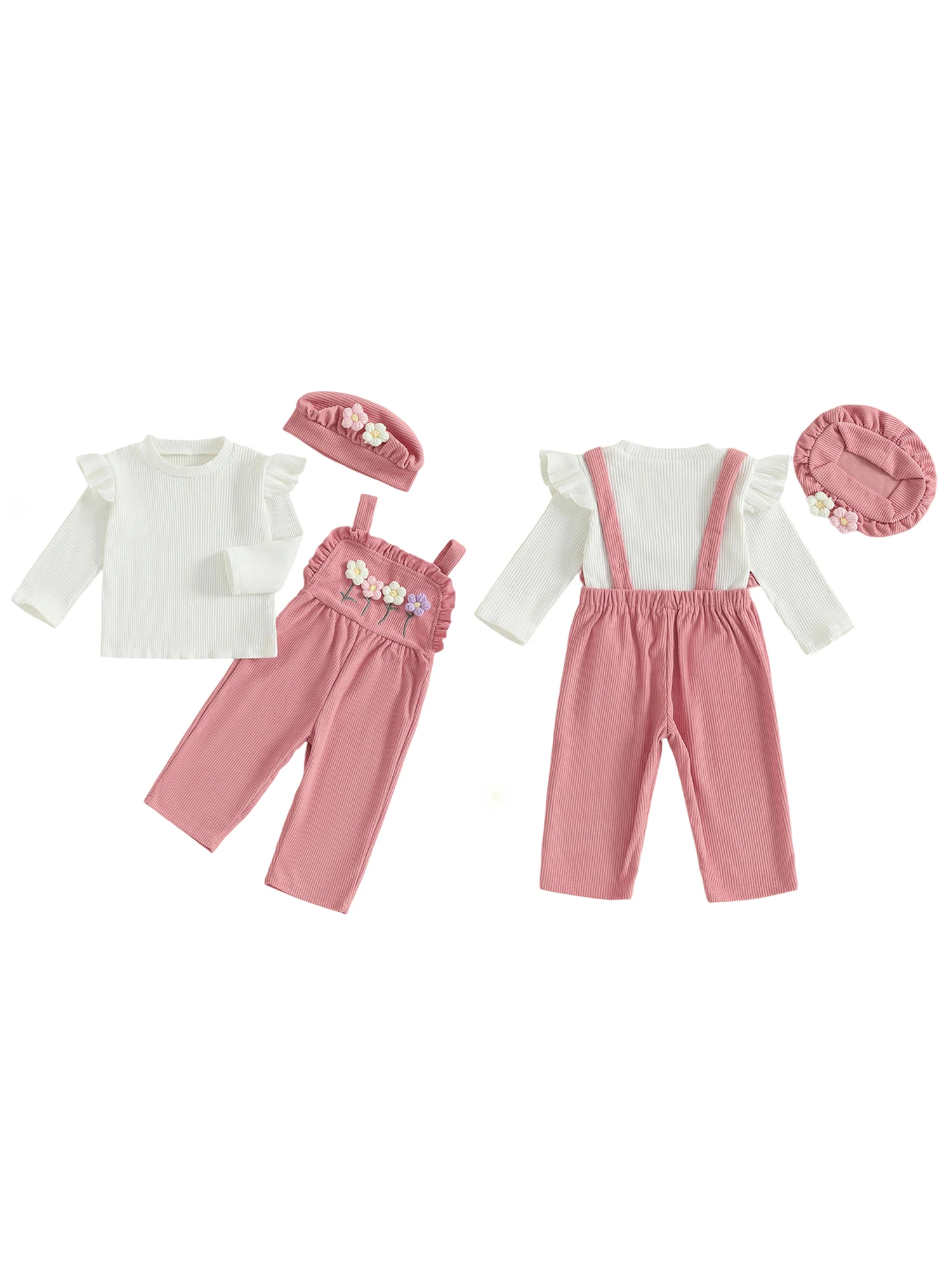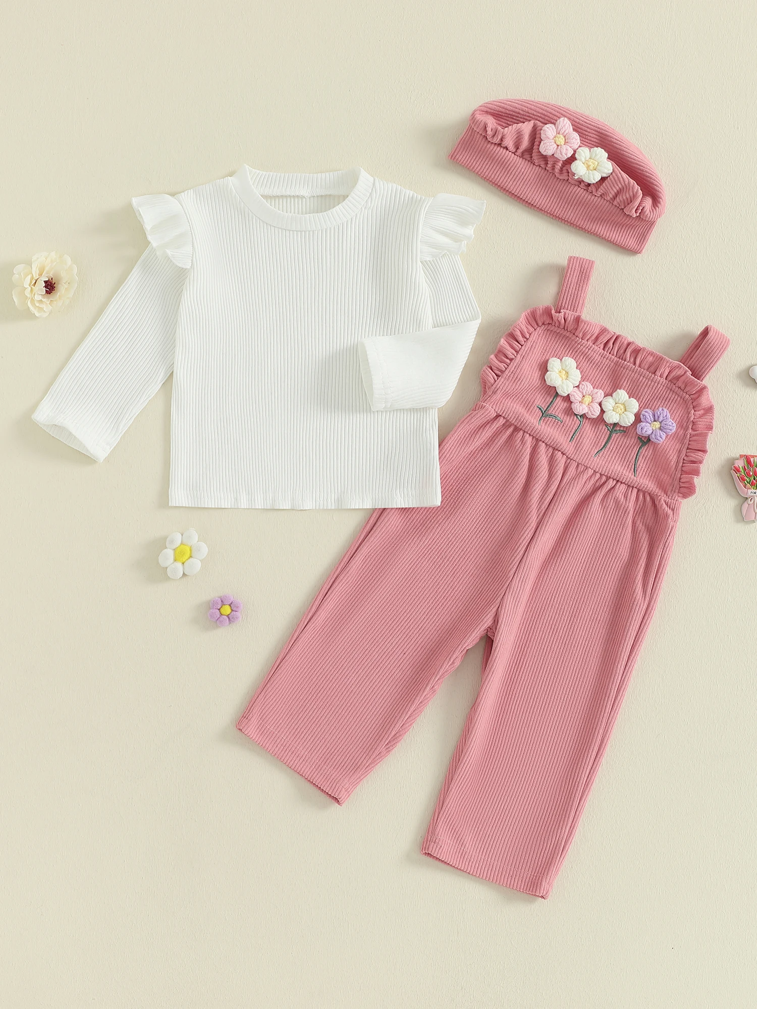 - Complete 3-piece knit set (T-shirt, floral overalls, and coordinating hat) for effortless, stylish outfits suitable for every season.
